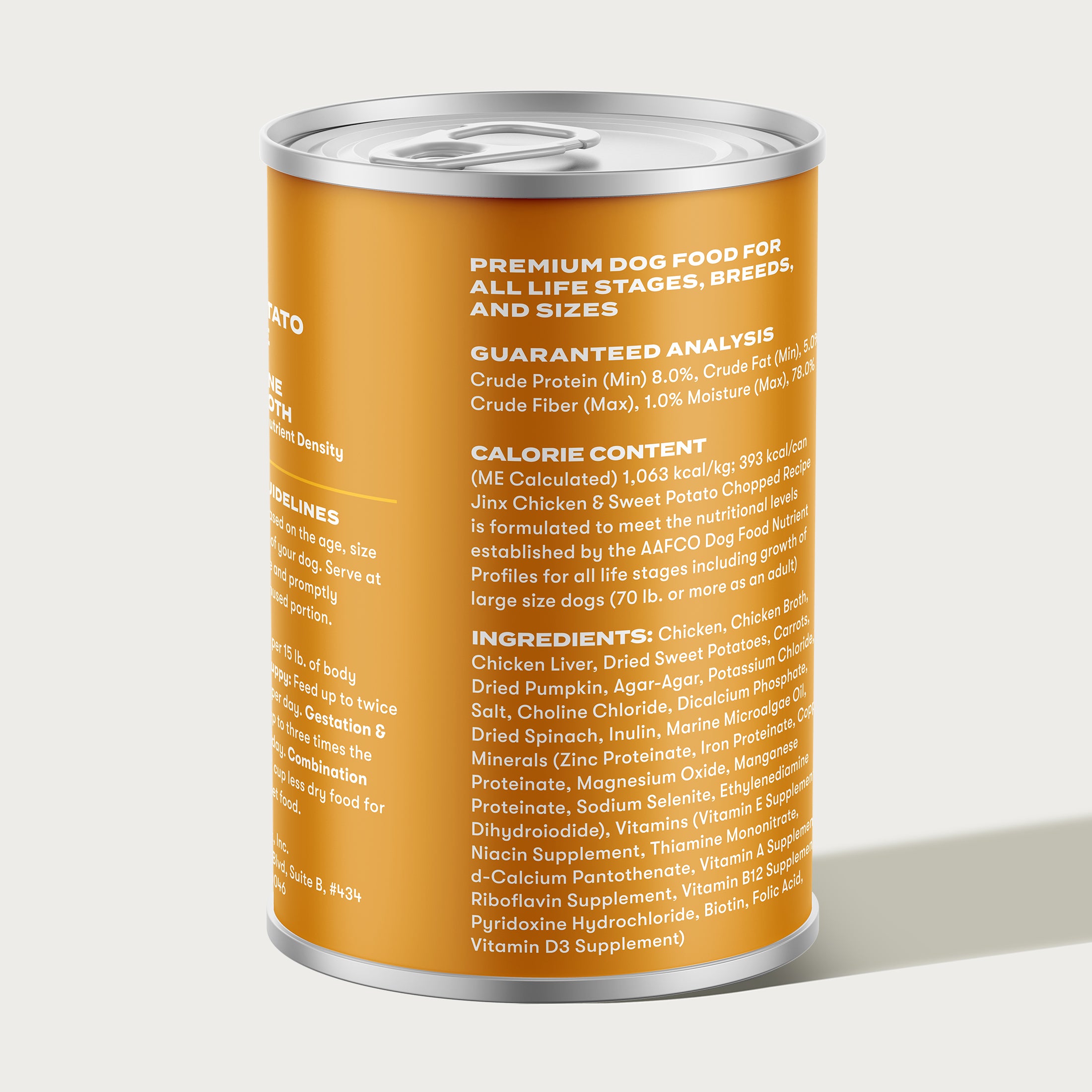 Jinx Chicken & Sweet Potato Chopped Recipe is formulated to meet the nutritional levels established by the AAFCO Dog Food Nutrient Profiles for all life stages including growth of large size dogs (70 lb. or more as an adult)